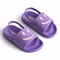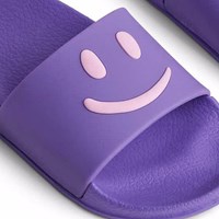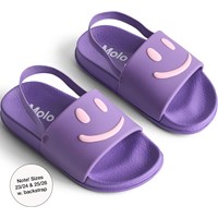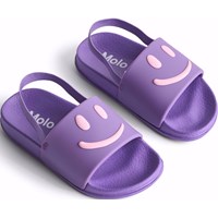 Lila Flip-Flops mit breitem Fußriemen und geformter Innensohle. Die Sandalen sind wasserabweisend und daher perfekt für den Pool oder Strand. Der Fußriemen hat ein lächelndes Gesicht in Pink. Die Größen 23/24 und 25/26 verfügen über einen praktischen elastischen Fersenriemen, der eine bequeme Passform gewährleistet.