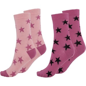 Zwei Paar Socken. Ein Paar ist rosa mit fuchsia-farbigen gestrickte Sternen und das andere Paar ist fuchsia-farbig mit schwarzen Sternen.