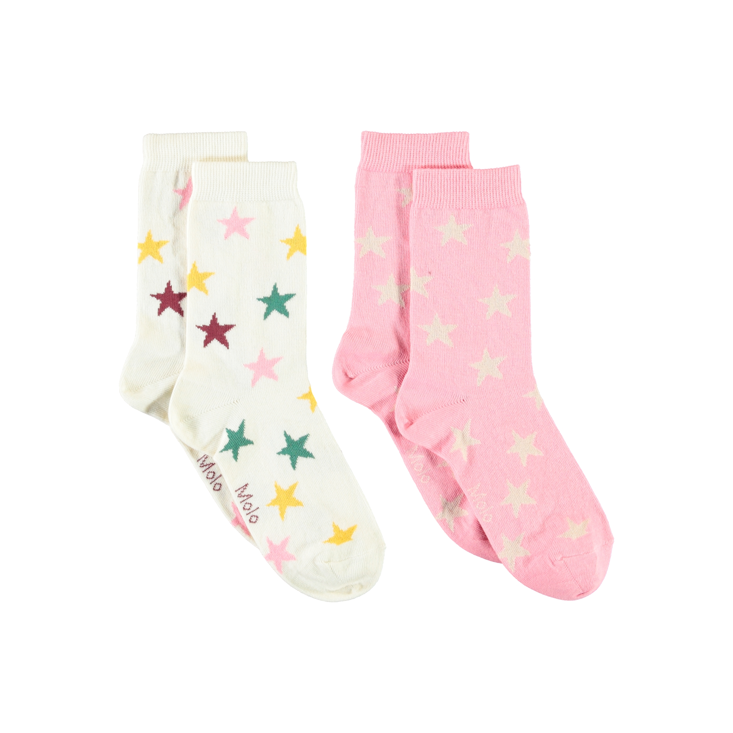 Zwei Paar Socken. Ein Paar ist in Weiß mit mehrfarbigen eingestrickten Sternen, und das andere Paar ist rosa mit hellen Sternen.