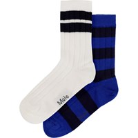 2er-Pack fein gestrickte Socken aus weicher Baumwollmischung mit geripptem Schaft und Gummizug am Abschluss. Die Packung enthält ein Paar blau-schwarz gestreifte Socken und ein Paar weiße Socken mit zwei schwarzen Streifen oben am Schaft.