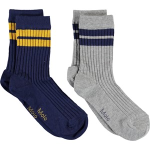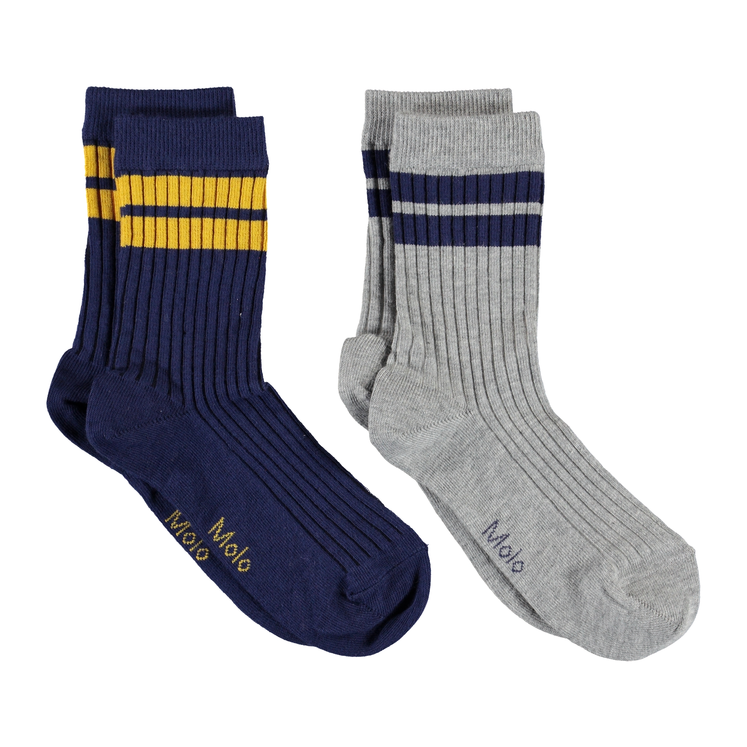 Zwei Paar graue und blaue Socken. Das graue Paar hat gelbe Streifen, während das blaue Paar sportliche blaue Streifen hat.