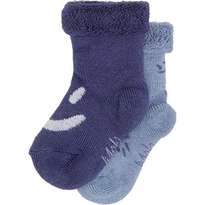2er-Pack Babysocken aus Öko-Baumwolle. Die Socken sind blau mit einem umklappbaren Rand und haben niedliche lächelnde Gesichter darauf.