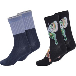 Zwei Paar gerippte Söckchen. Eines ist zweiteilig in dunkelblau und hellblau gewellt. Das andere in schwarz mit schönen Schmetterlingen. Dieses Produkt ist Öko-Tex zertifiziert.