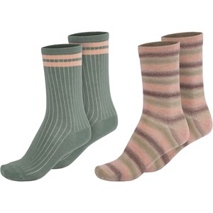 Zwei Paar gerippte Socken. Ein Paar ist grün mit rosa Streifen oben, während das andere Paar gestreift ist.