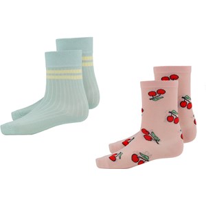 Zwei Paar Socken. Ein Paar ist gerippt und hellblau mit zwei gelben Streifen am Knöchel. Das andere Paar ist rosa mit Kirschen.Dieses
