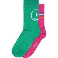 2er-Pack Feinstricksocken aus Öko-Baumwolle. Die Socken haben einen gerippten Rand oben, der dafür sorgt, dass sie den ganzen Tag an Ort und Stelle bleiben. Das Set enthält ein Paar hellblaue Schmetterlingssocken und ein Paar rote Glitzersocken mit zwei Herzen am Schaft.