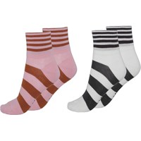 Zwei Paar kurze Socken. Ein Paar ist rosa und das andere Paar ist weiß. Beide sind mit Streifen.