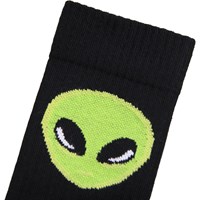 2er-Pack Baumwollsocken. Die Socken haben gerippten Schaft und elastischen Bund oben, und sie sind angenehm weich zu tragen. Das Set enthält ein Paar schwarze und ein Paar graue Socken. Beide mit einem grünen Alien auf der Rückseite.