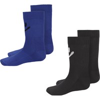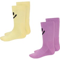 Zwei Paar sportliche Rippsocken. Ein Paar ist in Beige mit einem lächelnden Herzen auf der Rückseite. Das andere Paar ist in Apricotfarbe mit einem Peace-Zeichen an der Seite.