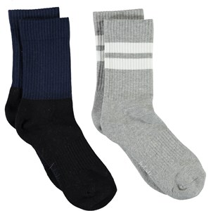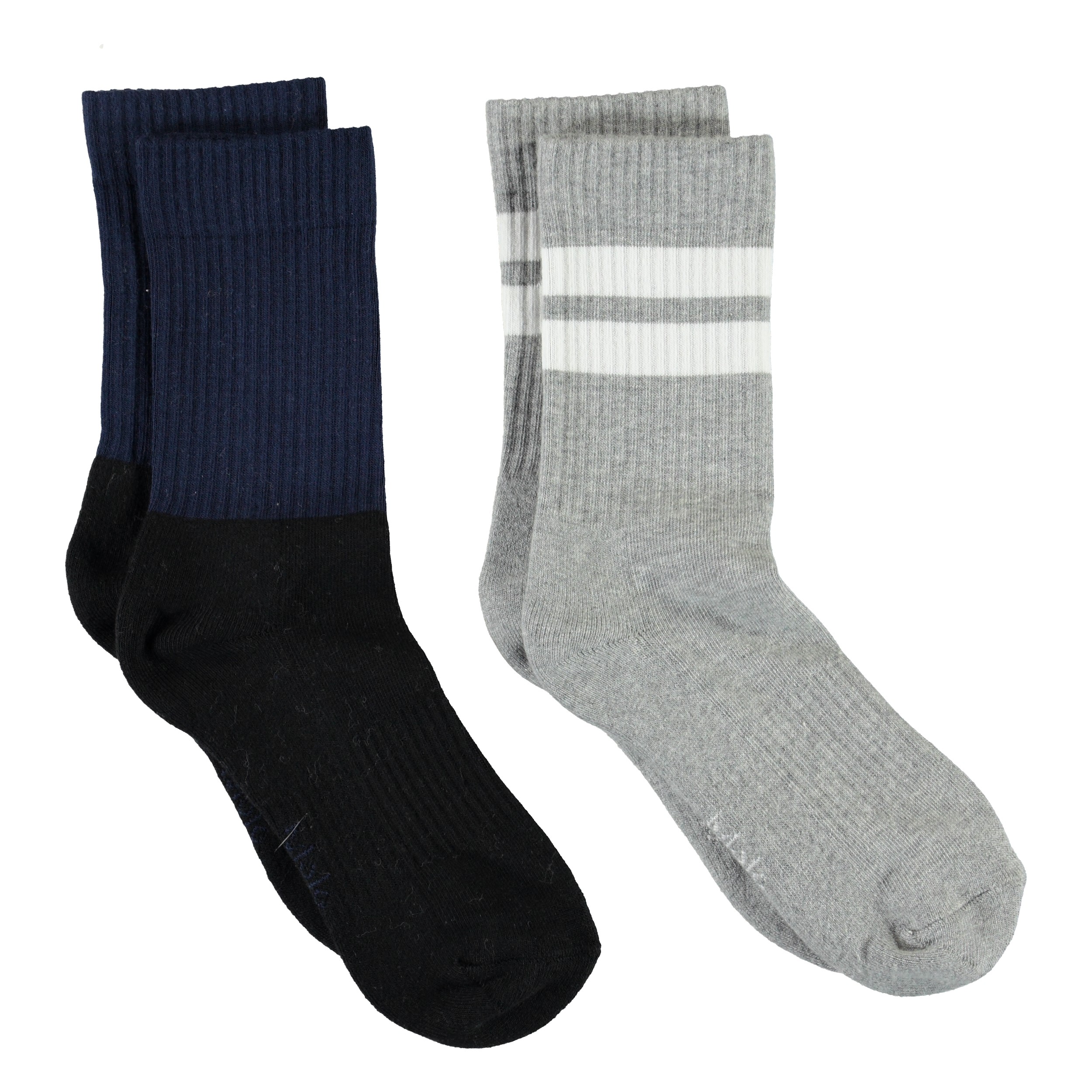 Zwei Paar Socken. Ein Paar ist schwarz und dunkelblau, während das andere grau mit sportlichen weißen Streifen ist.