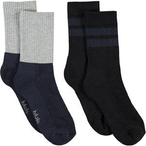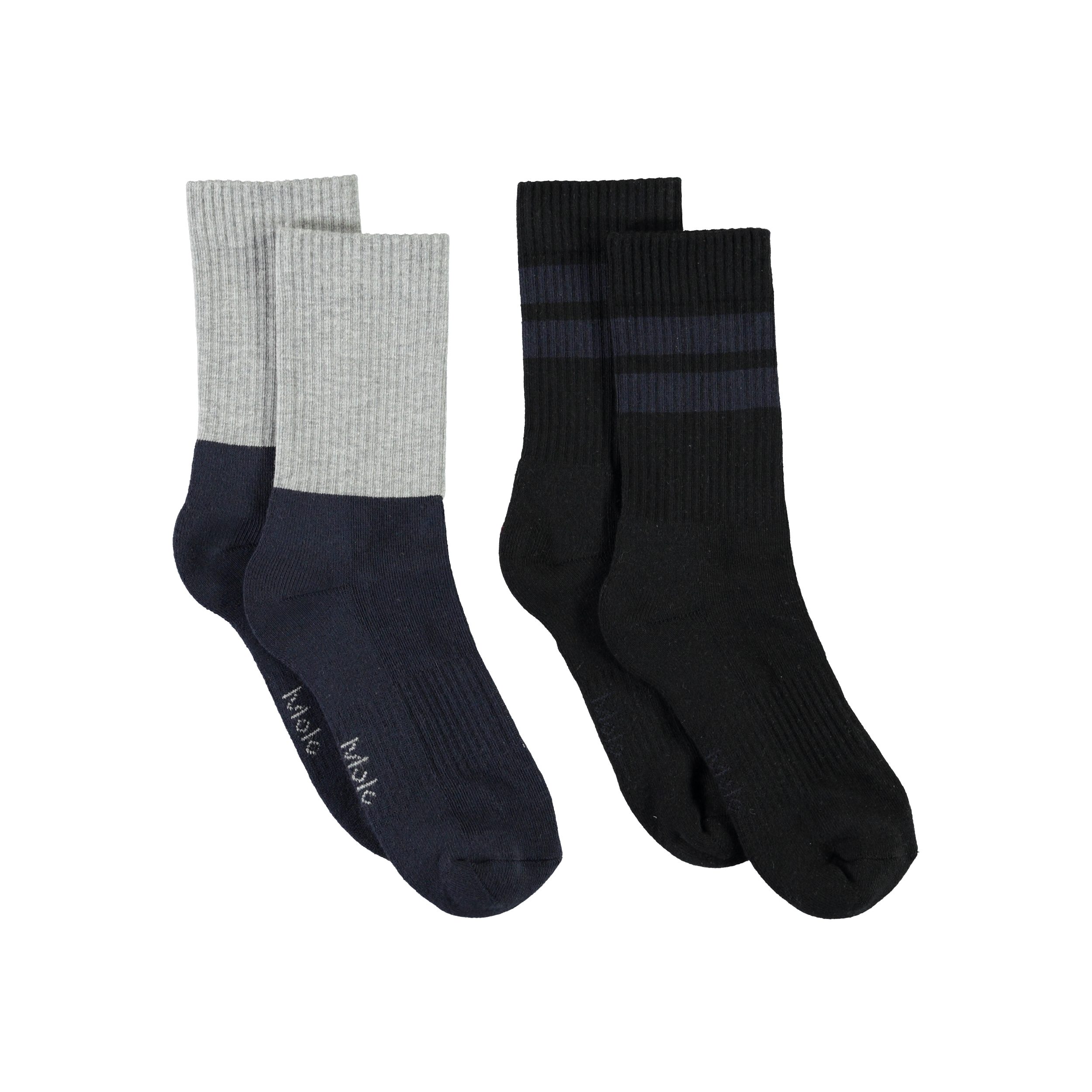 Zwei Paar Socken. Ein Paar ist in Blau mit grauem Schaft, während das andere Paar schwarz mit blauen Streifen ist.