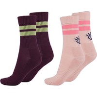Zwei Paar Socken. Ein Paar ist in dunklem Burgunderrot mit grünen Streifen, und das andere Paar in Rosa mit Streifen und einem gestrickten Motiv eines Auges hinten.