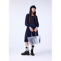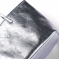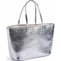 Große silberne Shopper-Tasche. Die Tasche misst oben 42 cm in der Breite und unten 30 cm, und ist 42 cm hoch, einschließlich der Henkel. Die Tasche verfügt über einen großen Innenraum sowie eine kleine Tasche mit Reißverschluss und Baumwollfutter.