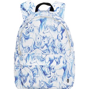 Weißer Rucksack mit einem Aufdruck aus blauen, handgezeichneten Pferden. Der Rucksack verfügt über ein großes Fach und eine gepolsterte Tasche, ideal für einen Laptop oder ein Tablet. Darüber hinaus verfügt er über eine Reißverschlusstasche auf der Vorderseite, Flaschentaschen auf beiden Seiten, gepolsterte Rücken- und Schultergurte sowie einen verstellbaren Brustgurt, der dabei hilft, das Gewicht gleichmäßig zu verteilen. Abmessungen: 30 x 17 x 42. Volumen: 21 l.