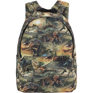 Rucksack in grünen und gelben Farbtönen mit einem Print verschiedener Dinosaurier. Dieser Rucksack bietet viel Platz für Bücher, Notizbücher, ein Federmäppchen, eine Brotdose und eine gepolsterte Tasche, mit Platz für einen Laptop oder ein Tablet. Er verfügt außerdem über eine Reißverschlusstasche vorne, Flaschentaschen auf beiden Seiten, gepolsterte Rücken- und Schultergurte sowie einen verstellbaren Brustgurt, der dabei hilft, das Gewicht gleichmäßig zu verteilen. Abmessungen: 30 x 17 x 42. Volumen: 21 l.