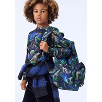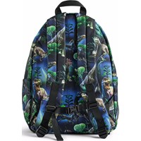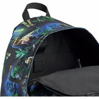 Bunter Rucksack mit Dinosaurier-Druck. Der Rucksack bietet viel Stauraum, einschließlich einer gepolsterten Tasche zum Schutz Ihres Computers oder Tablets. Er verfügt über eine Reißverschlusstasche vorne, Flaschentaschen an beiden Seiten sowie gepolsterte Rücken- und Schultergurte. Zusätzlich hat er einen verstellbaren Brustgurt, der hilft, das Gewicht gleichmäßig zu verteilen. Der Rucksack misst 30 x 17 x 42 cm und hat ein Volumen von 21 Litern.