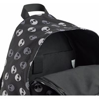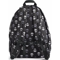 Schwarzer Rucksack mit einem Aufdruck von grauen Aliens. Der Rucksack bietet viel Stauraum, einschließlich einer gepolsterten Tasche, die deinen Computer oder Tablet schützt. Er verfügt über eine Reißverschlusstasche vorne, Flaschentaschen an beiden Seiten sowie gepolsterte Rücken- und Schultergurte. Zusätzlich hat er einen verstellbaren Brustgurt, der hilft, das Gewicht gleichmäßig zu verteilen. Der Rucksack misst 30 x 17 x 42 cm und hat ein Volumen von 21 Litern.