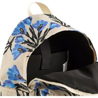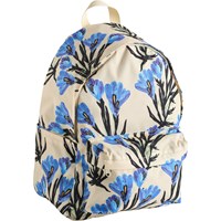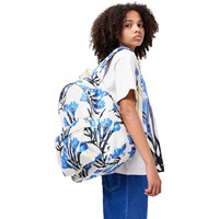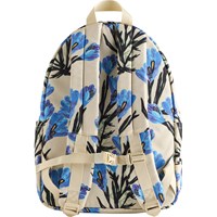 Cremefarbener Rucksack mit blauem Blumenmuster. Er hat ein gepolstertes Fach für einen Computer oder ein Tablet, eine Reißverschlusstasche vorne, Flaschentaschen an den Seiten und gepolsterte Träger. Der verstellbare Brustgurt und die Schultergurte sorgen für guten Komfort und Gewichtsverteilung. Maße: 30 x 17 x 42. Volumen: 21L.