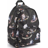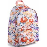 Hellvioletter Rucksack mit einem Druck bunter Blumen. Der Rucksack bietet viel Stauraum, einschließlich einer gepolsterten Tasche zum Schutz Ihres Computers oder Tablets. Er verfügt über eine Reißverschlusstasche vorne, Flaschentaschen an beiden Seiten sowie gepolsterte Rücken- und Schultergurte. Zusätzlich hat er einen verstellbaren Brustgurt, der hilft, das Gewicht gleichmäßig zu verteilen. Der Rucksack misst 30 x 17 x 42 cm und hat ein Volumen von 21 Litern.