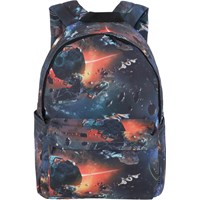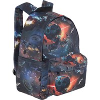 Rucksack mit Aufdruck von Raumschiffen und Weltall. Der Rucksack hat eine Außentasche, eine Schnalle vor der Brust, einen Griff und verstellbare Träger. Der Rucksack misst ca. 13 cm breit und ca. 29cm. in der Höhe und eignet sich besonders für kleinere Kinder.