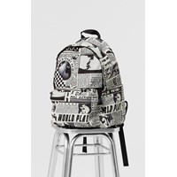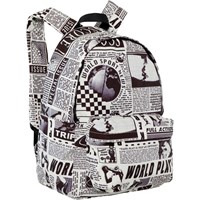 Schwarzer und weißer Rucksack mit einem Zeitungscollage-Druck, der verschiedene Sportarten zeigt. Der Rucksack bietet viel Stauraum, darunter ein gepolstertes Fach, das deinen Laptop oder dein Tablet schützt. Er ist mit einer Reißverschlusstasche an der Vorderseite, Flaschentaschen auf beiden Seiten und gepolsterten Rücken- und Schultergurten ausgestattet. Außerdem verfügt er über einen verstellbaren Brustgurt, der eine gleichmäßige Gewichtsverteilung gewährleistet. Maße: 30 x 17 x 42 cm. Volumen: 21L.