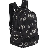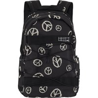 Geräumiger Rucksack in Schwarz mit weißem peace sign print. Dieser Rucksack ist ideal für Skateboarder, da er über zwei Klettverschlüsse und ein elastisches System an der Vorderseite verfügt, um das Skateboard und den Helm zu befestigen. Außerdem verfügt er über zwei geräumige Fächer, eines davon mit gepolsterter Tasche für ein Tablet oder Laptop und bietet ausreichend Platz für Schulsachen. Die Tasche verfügt über eine Reißverschlusstasche auf jeder Seite, gepolsterte Rücken- und Schultergurte für Komfort und einen verstellbaren Brustgurt, der die Schultern entlastet. Abmessungen: 29 x 15 x 42. Volumen: 18 l.
