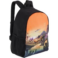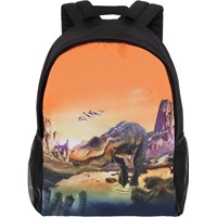 Schwarzer Rucksack mit einer orangefarbenen Vorderseite und einem Print eines T-Rex. Der Rucksack bietet viel Stauraum, darunter ein gepolstertes Fach, das deinen Laptop oder dein Tablet schützt. Er ist mit Flaschentaschen auf beiden Seiten und gepolsterten Rücken- und Schultergurten ausgestattet. Außerdem verfügt er über einen verstellbaren Brustgurt, der eine gleichmäßige Gewichtsverteilung gewährleistet. Abmessungen: 30 x 17 x 42. Volumen: 21L.