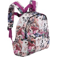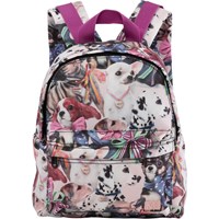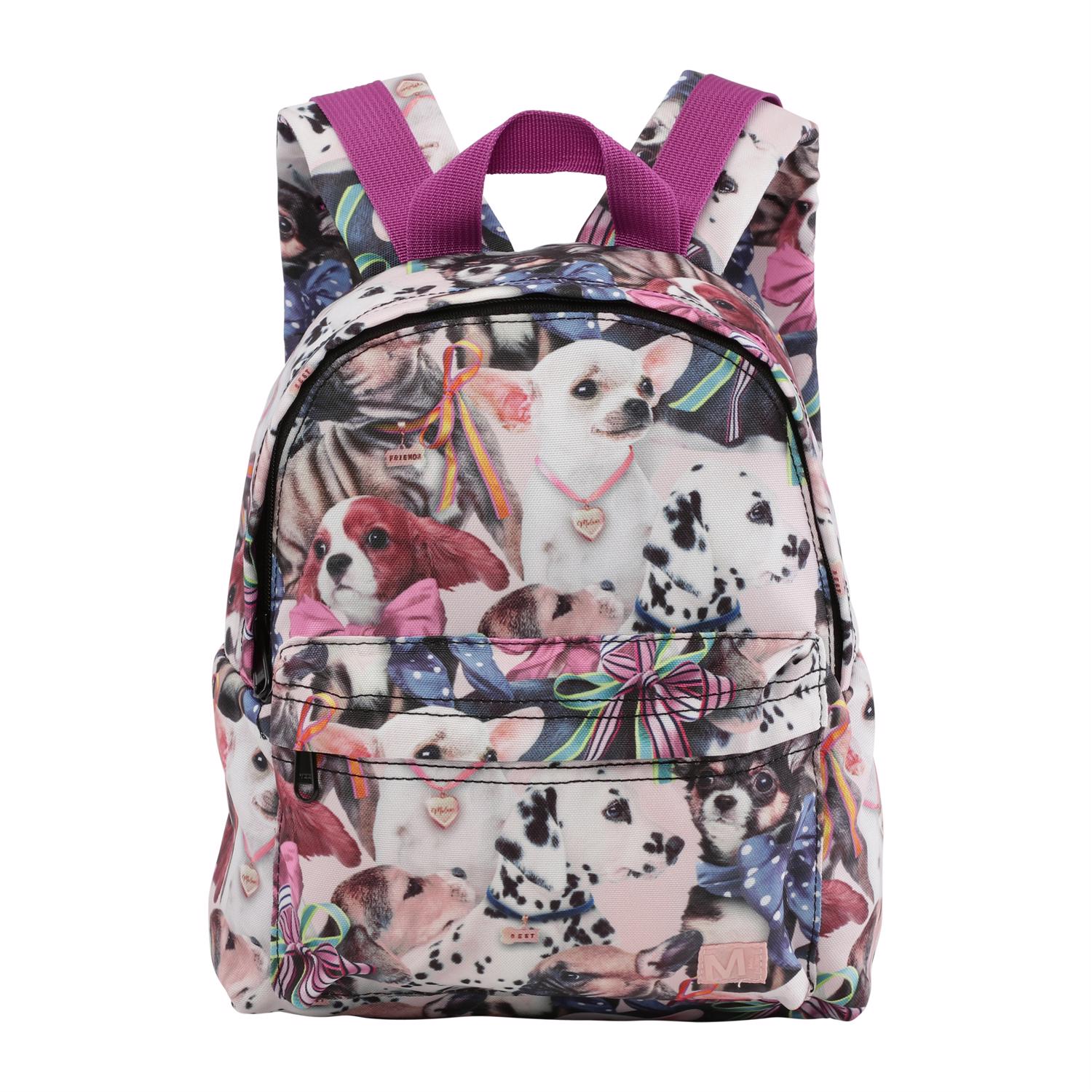 Rucksack mit Druck von kleinen Hunden mit Schleifen um den Hals. Der Rucksack hat eine Außentasche, Schnalle vor der Brust und verstellbare Schultergurte. Dieses Molo-Produkt ist recycelt und besteht aus wiederverwertbaren Polyester, das aus gebrauchten Kunststoffflaschen und anderem Restabfall hergestellt ist. Die Herstellung von recyceltem Polyester erfordert weit weniger Ressourcen und leitet weniger CO2 aus, weshalb Molos recycelte Rucksäcke die nachhaltige Wahl sind. Der Rucksack ist 25 cm breit und 30 cm in der Höhe.