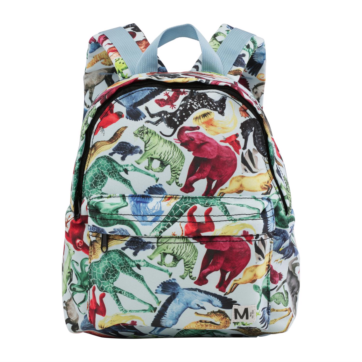 Hellblauer Rucksack mit Druck verschiedenen bunten Tieren. Der Rucksack hat eine Außentasche, Schnalle vor der Brust und verstellbare Schultergurte. Dieses Molo-Produkt ist recycelt und besteht aus wiederverwertbaren Polyester, das aus gebrauchten Kunststoffflaschen und anderem Restabfall hergestellt ist. Die Herstellung von recyceltem Polyester erfordert weit weniger Ressourcen und leitet weniger CO2 aus, weshalb Molos recycelte Rucksäcke die nachhaltige Wahl sind. Der Rucksack ist 25 cm breit und 30 cm in der Höhe.