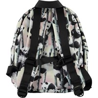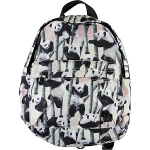 Rucksack mit Aufdruck von Pandabären. Der Rucksack hat eine Außentasche mit Reißverschluss, eine Schnalle an der Brust, Träger zum Aufhängen und verstellbare Schulterträger.