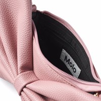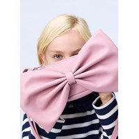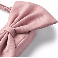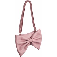 Pinkfarbene Tasche mit großer angesetzter Schleife. Die Tasche misst 15,5 cm in der Breite und 9,5 cm in der Höhe sowie einen verstellbaren Riemen. Im Inneren hat die Tasche ein schwarzes Innenfutter und eine kleine Reißverschlusstasche.