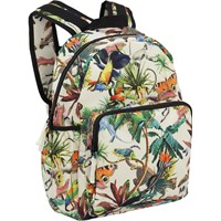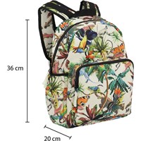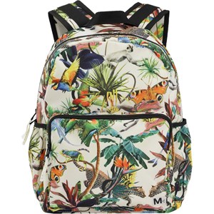 Geräumiger Rucksack mit buntem Druck eines surrealen Fantasy-Dschungels auf beigem Hintergrund. Das Material des Rucksacks besteht aus recyceltem Polyester. Der Rucksack verfügt über eine äußere Fronttasche mit Reißverschluss, beidseitige Taschen für z.B. eine Wasserflasche, gesteppter Rücken, Trageriemen zum Aufhängen sowie verstellbare Schultergurte und eine Innentasche. Dieses Molo-Produkt ist recycelt und besteht aus recycelbarem Polyester, das aus gebrauchten Plastikflaschen und anderem Restmüll hergestellt wird. Die Herstellung von recyceltem Polyester erfordert weit weniger Ressourcen und emittiert weniger CO2.
