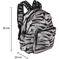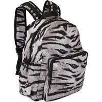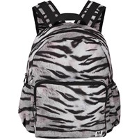 Geräumiger Rucksack mit schwarz-weißem Tiger-Print aus recyceltem Polyester. Der Rucksack verfügt über eine äußere Fronttasche mit Reißverschluss, beidseitige Taschen für beispielsweise eine Wasserflasche, gepolsterte verstellbare Schultergurte und einen Riemen zum Aufhängen. Dieses Molo-Produkt ist recycelt und besteht aus recycelbarem Polyester, das aus gebrauchten Plastikflaschen und anderem Restmüll hergestellt wird. Die Herstellung von recyceltem Polyester benötigt weit weniger Ressourcen und emittiert weniger CO2.