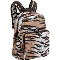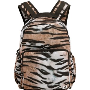 Geräumiger Rucksack mit Tigerdruck. Das Rucksackmaterial besteht aus recyceltem Polyester. Der Rucksack hat eine äußere Vordertasche mit Reißverschluss und M-3 Label, beidseitige Taschen für beispielsweise eine Trinkflasche, einen wattierten Rücken, einen Aufhängungsriemen und verstellbare Schultergurte.