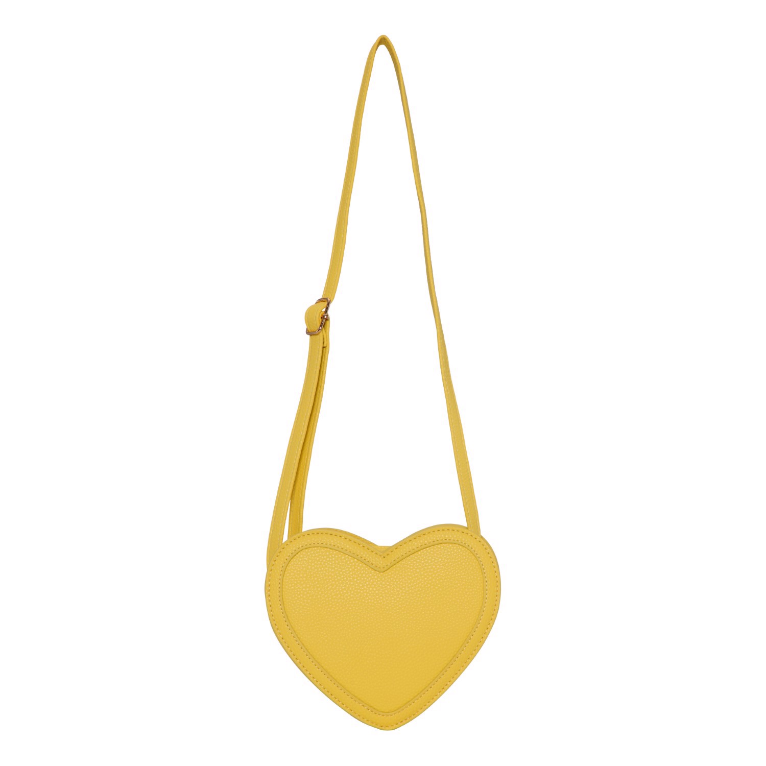 Gelbe, herzförmige Tasche aus Kunstleder mit verstellbarem Schultergurt und Reißverschluss.