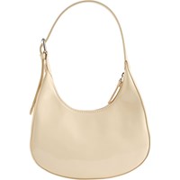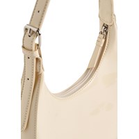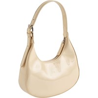Beige Schultertasche mit geschwungener Form und glänzendem Lackfinish. Die Tasche hat einen Reißverschluss und einen verstellbaren Riemen, sodass sie bei Bedarf leicht angepasst werden kann.