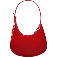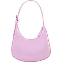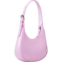 rosa Schultertasche mit gebogener Form, glänzendem Finish, Reißverschluss und verstellbarem Gurt.