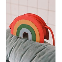 Hier ist eine Tasche in Form eines Regenbogens mit einem bunten Regenbogenmotiv auf beiden Seiten. Die Tasche hat einen verstellbaren roten Schultergurt.
