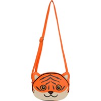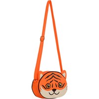 Umhängetasche in Orange mit süßem Tigermotiv auf der Vorderseite. Die Tasche schließt mit einem Reißverschluss, hat einen verstellbaren Schultergurt und ein kleines Innenfach mit Reißverschluss.