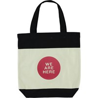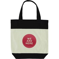 Tote Bag in schwarz und weiß mit rotem Kreis und dem Text 'We are here' auf der Vorderseite.