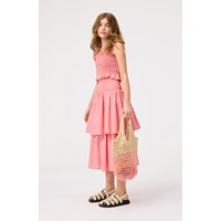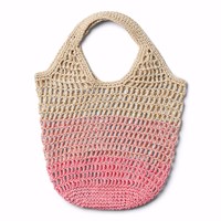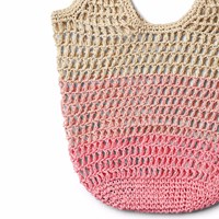 Feine gehäkelte Tasche, die von Pink über Hellrosa bis Beige übergeht. Die Tasche misst 47 cm in der Länge, einschließlich des Griffs.