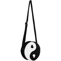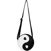 Umhängetasche in Schwarz und Weiß mit Yin- und Yang-Motiv. Die Tasche schließt mit einem Reißverschluss, hat einen verstellbaren Schultergurt und ein kleines Innenfach mit Reißverschluss.