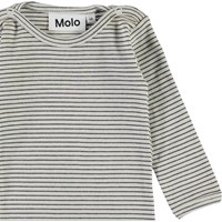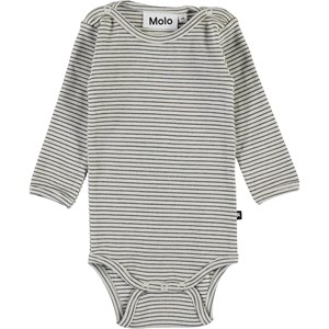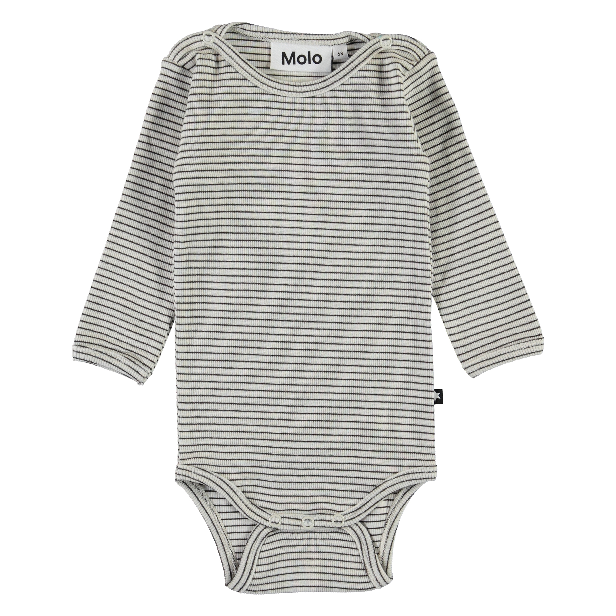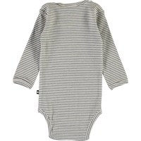 Fair ist ein langärmeliger Baby-Body in Ripp-Qualitet mit feinen schmalen Streifen in Braun und Weiß. Knöpfe am Hals und zwischen den Beinen erleichtern das An- und Ausziehen.