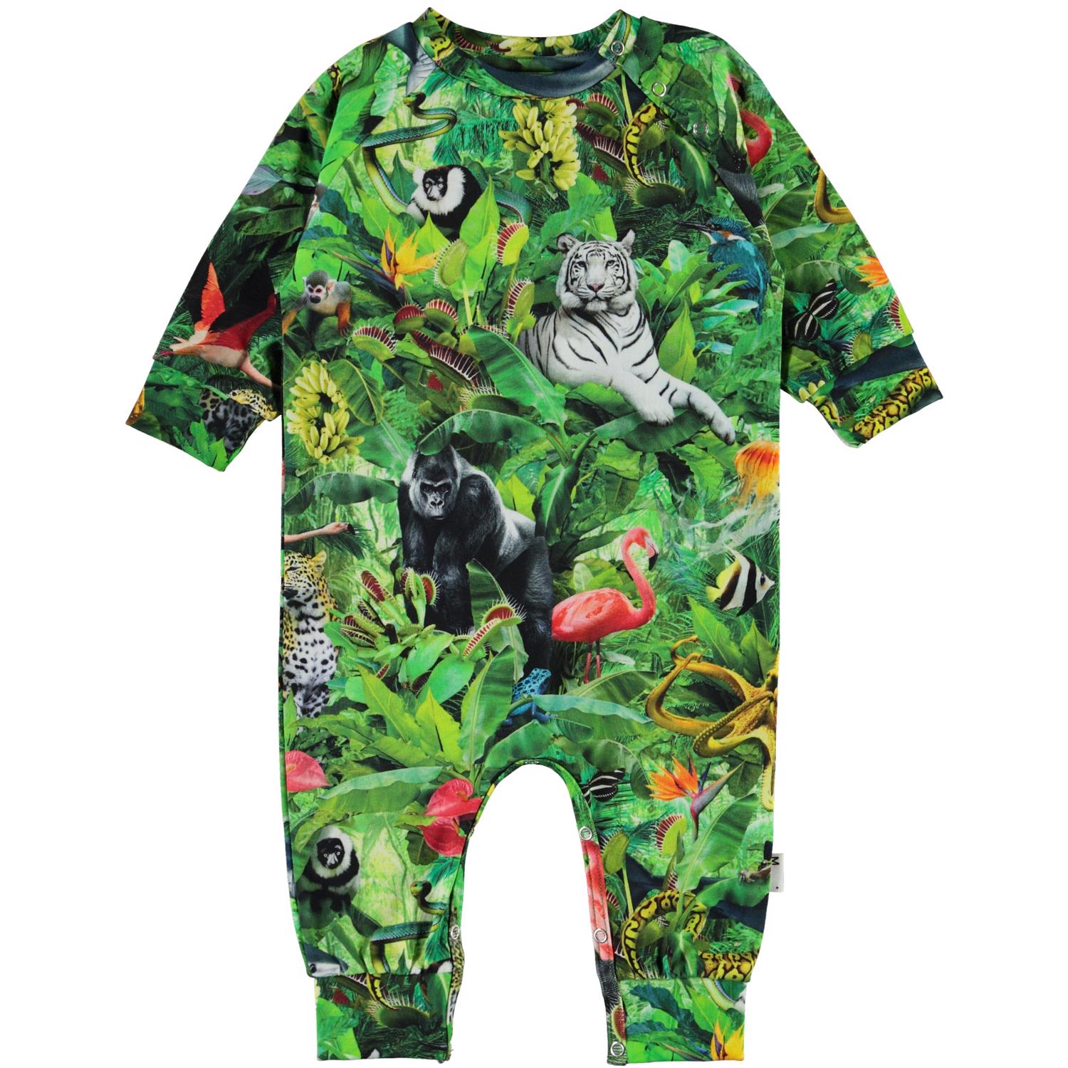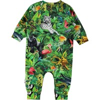 Fairfax ist ein Baby-Anzug mit aufgedrucktem 'Fantasy Jungle', mit vielen verschiedenen Tieren im Dschungel, die in der Regel sich dort nicht befinden. Der Anzug hat Raglanärmel und Druckknöpfe schräg am Hals und zwischen den Beinen, die das aus und anziegen einfach machen. Ecocert Greenlife, certifikationsnr. 197496