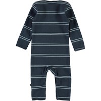 Faso ist ein blau gestreifter Ripp-Baby-Anzug mit langen Beinen und Ärmeln. Druckknöpfe am Hals und Beine machen das an- und ausziehen einfach.  Ecocert Greenlife, certifikationsnr. 197496