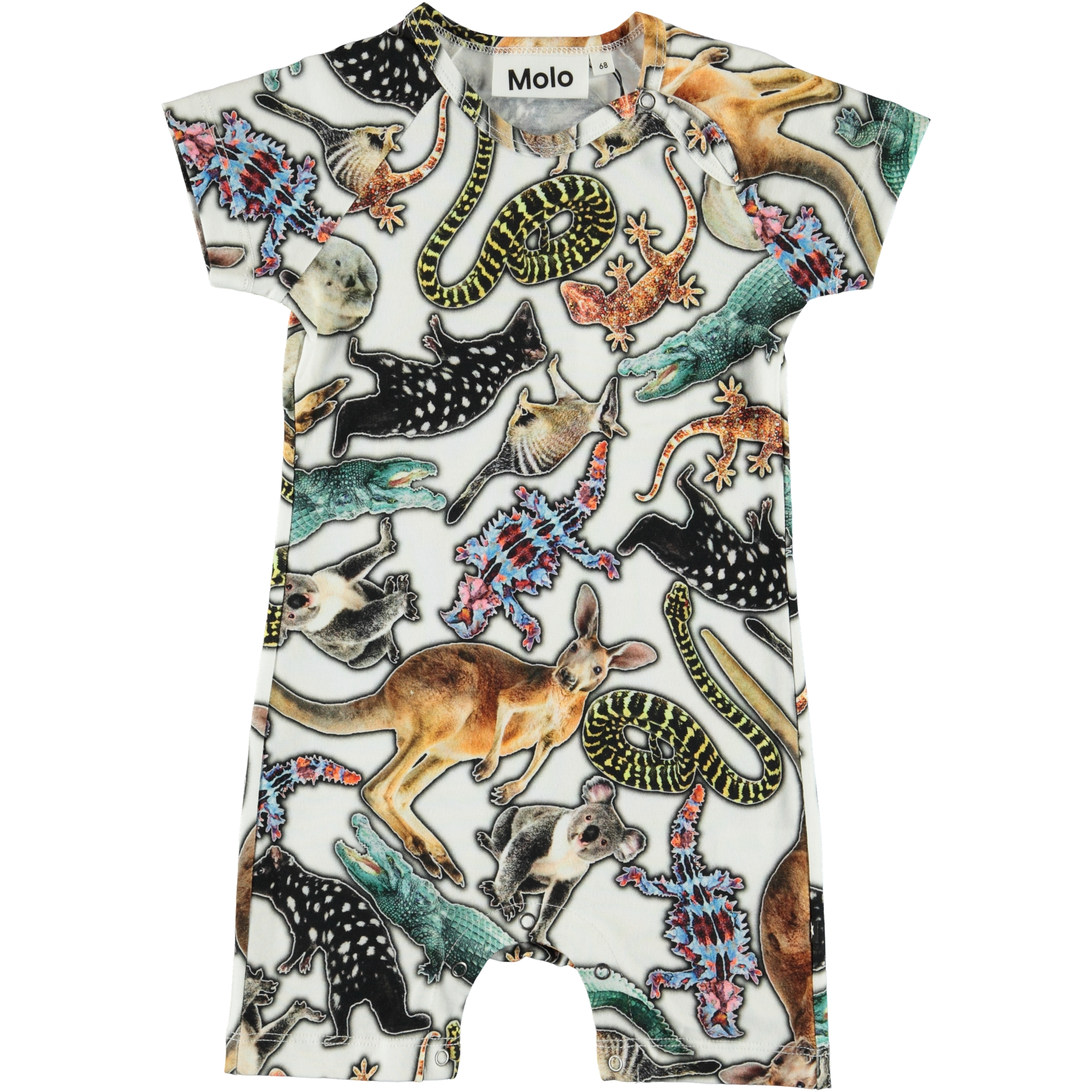 Felton ist ein Babybody mit einem Allover-Print der australischen Tierwelt. Der Body hat kurze Ärmel und Beine. Knöpfe am Hals und zwischen den Beinen erleichtern das An- und Ausziehen des Körpers.