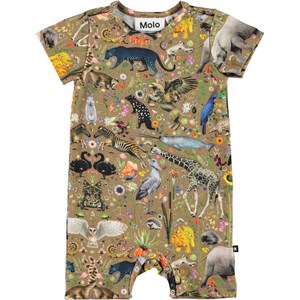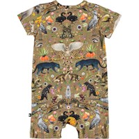 Felton ist ein hellbrauner Anzug mit einem fantastischen und detaillierten Druck von surrealistischen Tieren und Pflanzen. Der Anzug hat kurze Ärmel und Beine. Druckknöpfe am Hals und zwischen den Beinen erleichtern das An- und Ausziehen.