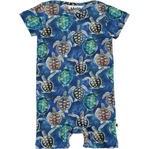 Felton ist ein blauer Baby-Body mit Druck von Schildkröten. Der Body hat kurze Ärmel und Beine. Druckknöpfe am Hals und zwischen den Beinen machen das an- und ausziehen einfach. Ecocert Greenlife, certifikationsnr. 197496