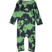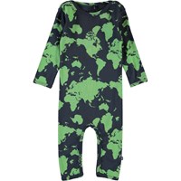 Fenez ist ein Baby-Anzug mit langen Beinen und Ärmeln in blau und grün mit Druck einer Weltkarte. Druckknöpfe am Hals und Beine machen das an- und ausziehen einfach. Ecocert Greenlife, certifikationsnr. 197496