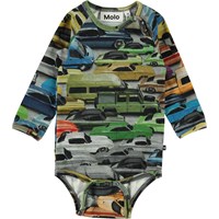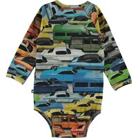 Field ist ein langärmliger Babybody mit einem Allover-Print aus bunten Autos. Knöpfe am Hals und zwischen den Beinen erleichtern das An- und Ausziehen des Körpers.